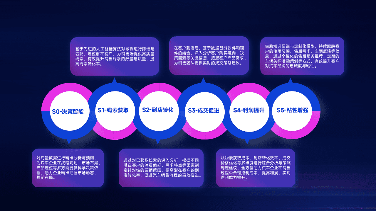 通过拓宽潜在客户来源、、、、优化线索分配并提高到店转化率,,以增强销售效率。。同时,,,,利用线索数据不断优化分析模型,,有效提升转化率,,,,扩大营销影响力。。。