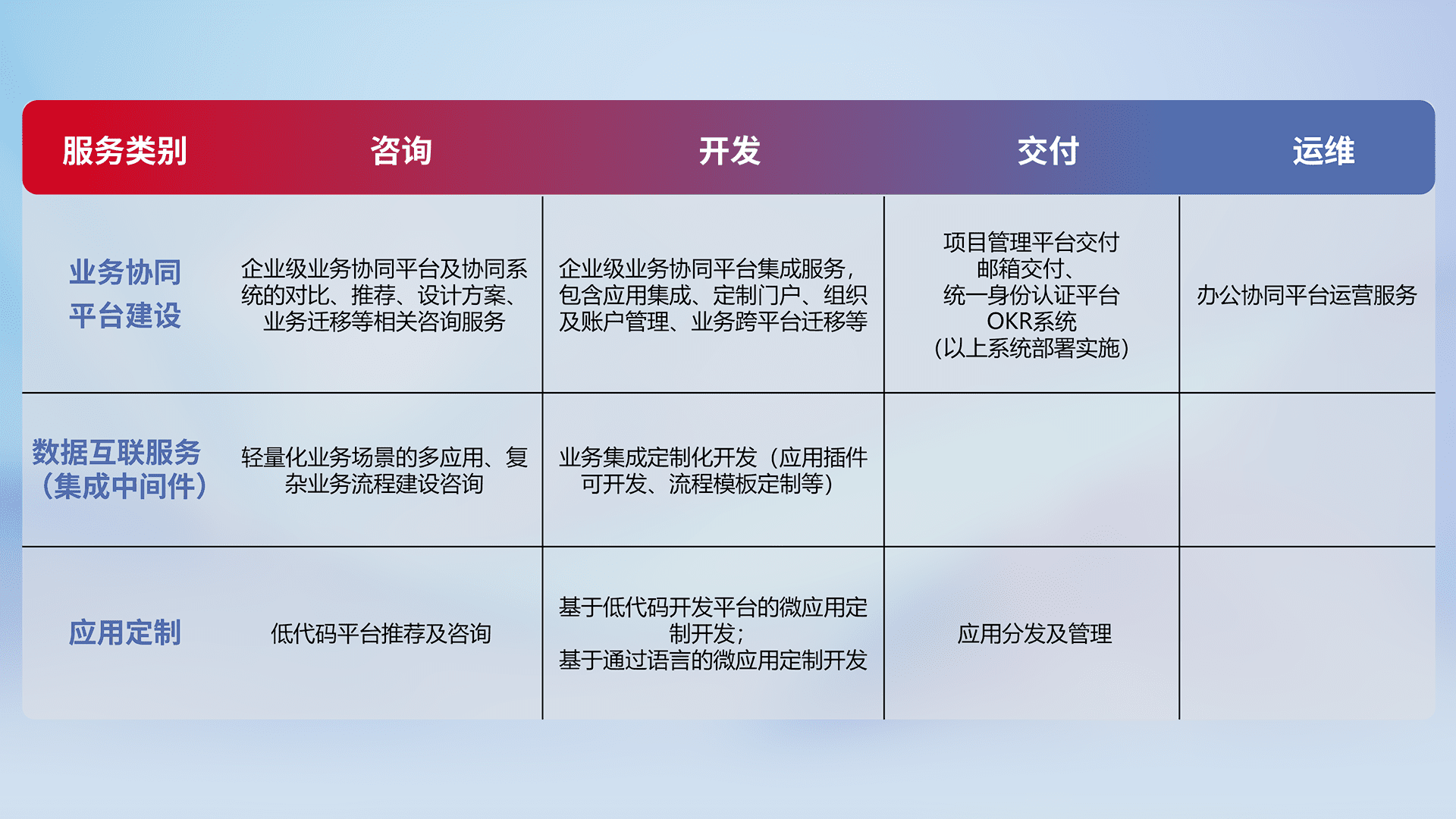 针对钉钉、、企微、、IDaas等平台级产品提供产品的规划、、方案、、交付、、定制化开发等服务,,,,实现如统一协同办公、、、智能客户服务、、、混合会议管理、、、智能数据查询、、、、等业务场景,,,实现数字化转型。。。